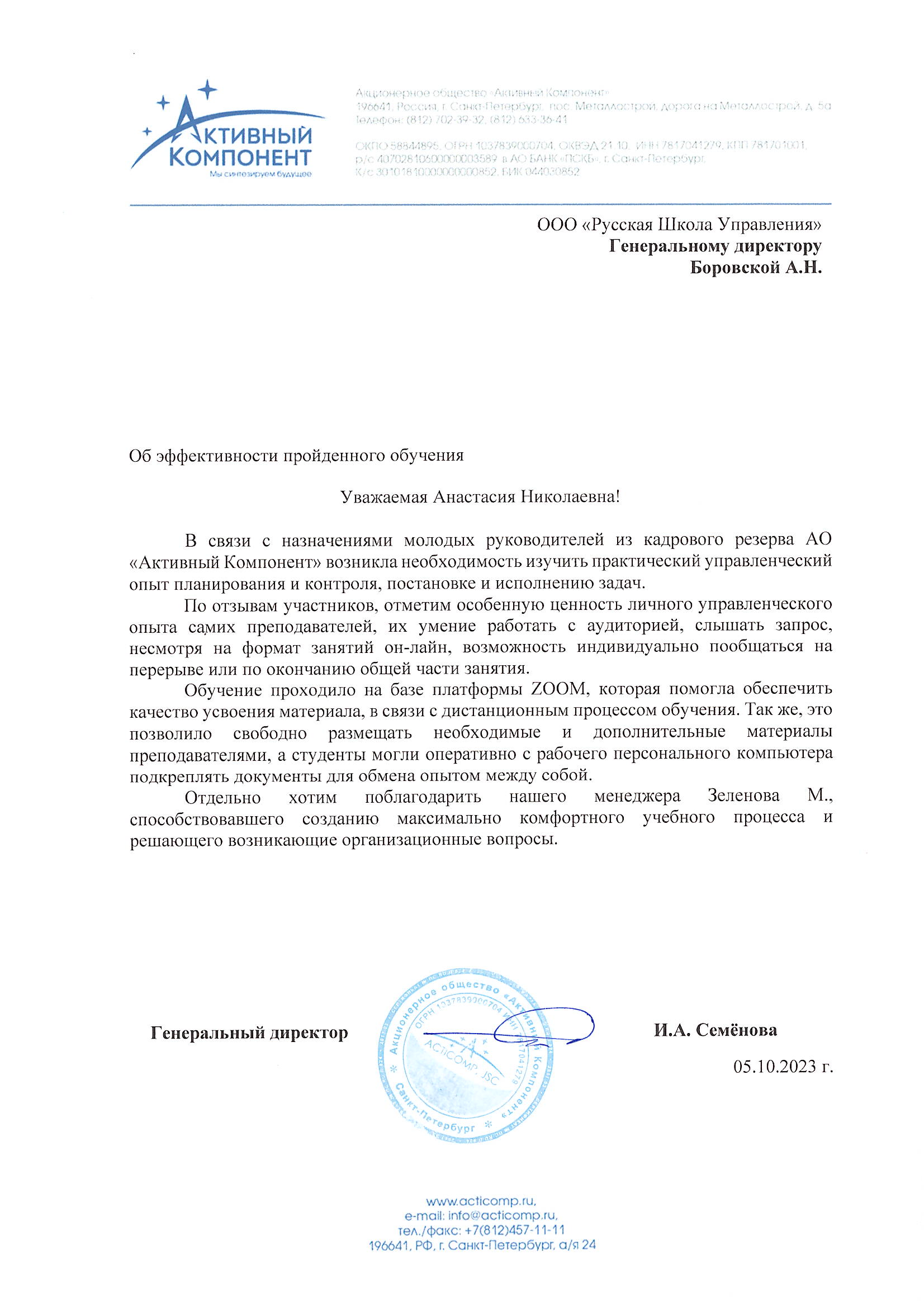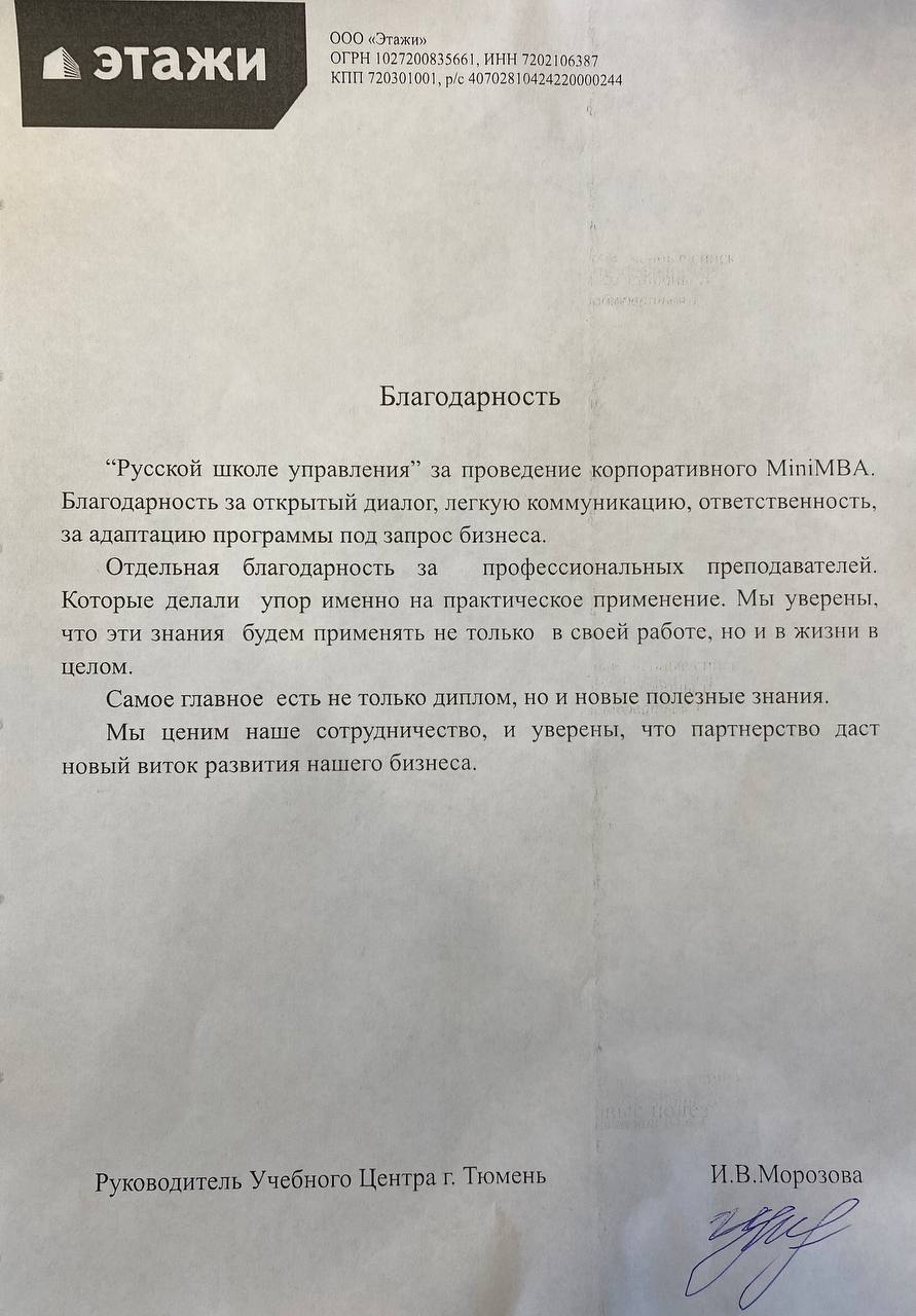"Сотрудники приняли участие в обучающей инфосессии по развитию базовых компетенций в области экономики и финансов. Выражаем благодарность руководству Русской школы управления и Д.Г. Лукинскому за проявленную гибкость и внимательность к заказчику, вовлеченность в процесс корректировки учебной программы под запрос бизнеса и высокое качество оказанных услуг."