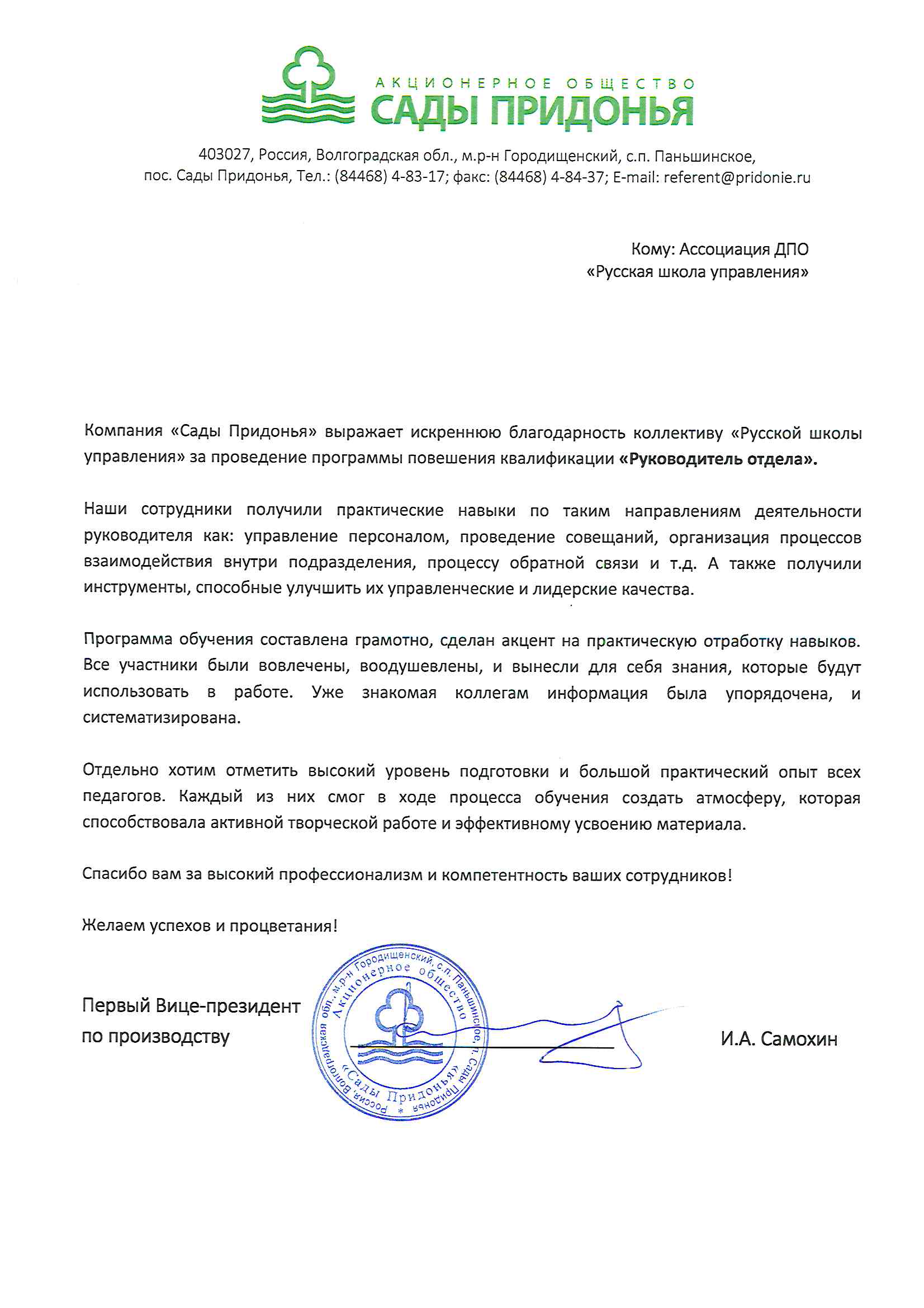 "Программа была разбита на модули в соответствии с потребностями нашего предприятия. Теоретический материал закреплялся не только практическими заданиями, но и яркими, интересными примерами их профессионального опыта бизнес-тренера."