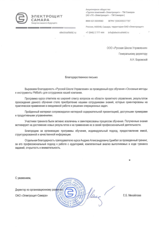 “Программа курса ответила на широкий спектр вопросов из области проектного управления, результатом прохождения данного обучения стало приобретение нашими сотрудниками знаний, которые ориентированы на практическое применение в ежедневной работе и решении операционных задач.”